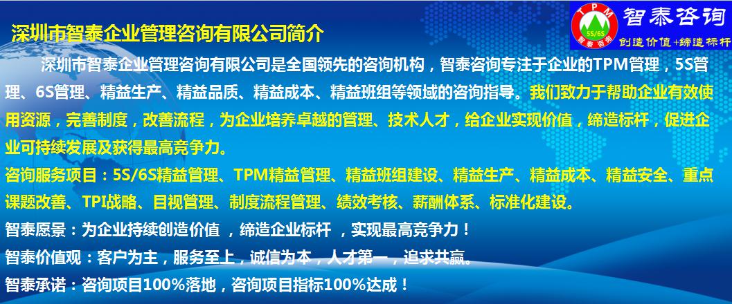 6S管理找哪家呢?首選深圳智泰咨詢公司,深圳市智泰企業(yè)管理咨詢有限公司是國內(nèi)專業(yè)及權(quán)威的咨詢機(jī)構(gòu),只專注于企業(yè)的5S/6S管理,TPM管理全面提升的咨詢輔導(dǎo),由具有二十年管理經(jīng)驗的顧問團(tuán)隊為您服務(wù)!萬件成功案例助您樹標(biāo)桿,智泰咨詢全力為您的企業(yè)發(fā)展及強(qiáng)大提供幫助!