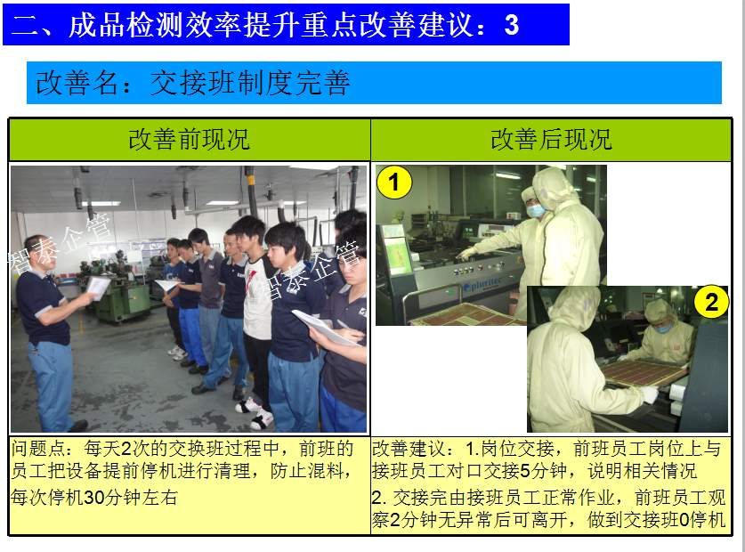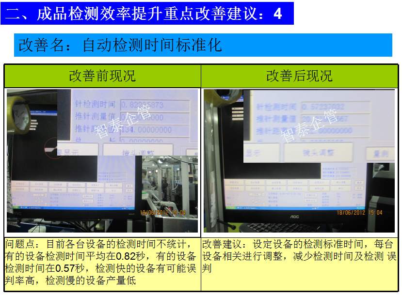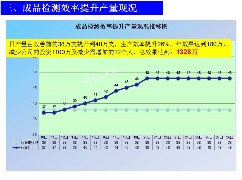 世界級(jí)制造及精益管理是智泰人一生追求的理想,智泰咨詢?cè)谄髽I(yè)推進(jìn)精益生產(chǎn)后平均生產(chǎn)效率提升35%以上,智泰專業(yè)團(tuán)隊(duì)為企業(yè)消除八大浪費(fèi),通過(guò)精益管理,提高企業(yè)的生產(chǎn)效率和產(chǎn)品質(zhì)量,持續(xù)推進(jìn)焦點(diǎn)課題改進(jìn)重大問(wèn)題,每年給企業(yè)帶來(lái)的收益平均有800萬(wàn)以上,附件為智泰咨詢顧問(wèn)團(tuán)隊(duì)為某企業(yè)生產(chǎn)效率提升的案例,請(qǐng)查閱: